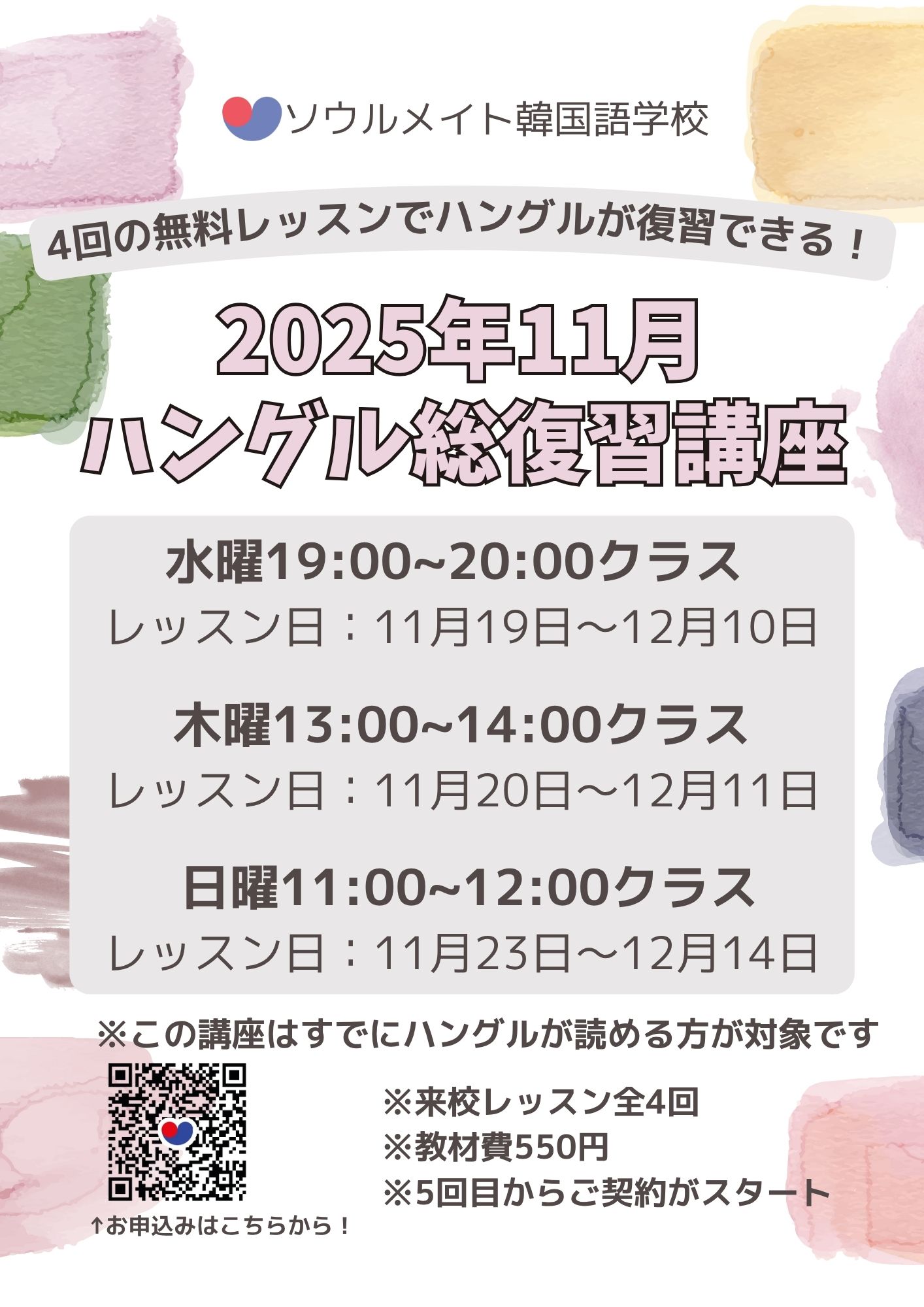 | ハングル総復習無料講座開催イベント(11月) | 2025-11-01 |