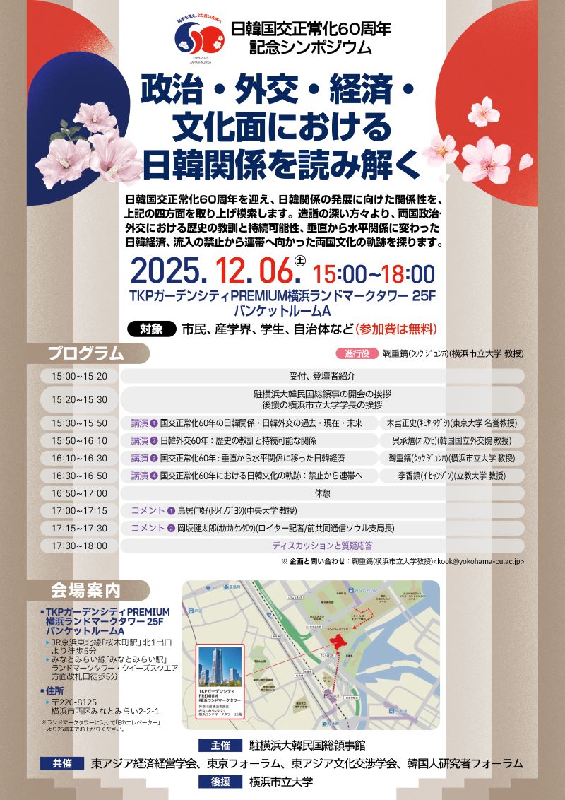 駐横浜大韓民国総領事館は、韓日国交正常化60周年を記念し、政治・外交・経済・文化など多角的な視点から韓日関係を立体的に考察し、両国関係の持続的かつ安定的な発展の方向性を共に探ることを目的として、韓日両国の専門家をお招きし、下記のとおりシンポジウムを開催いたします。