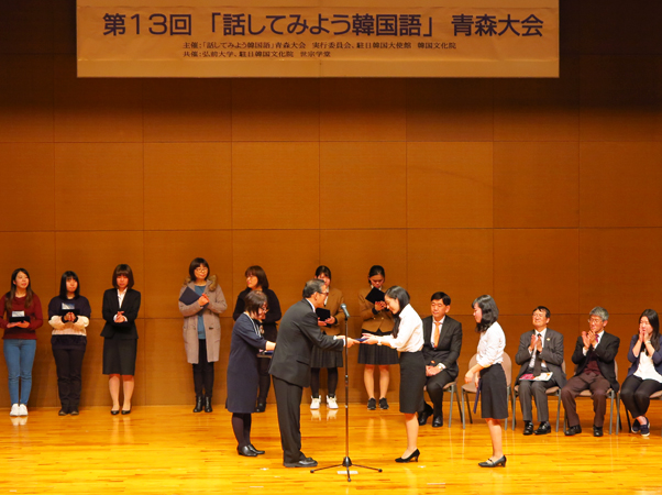 去る2017年12月16日(土)、弘前市の弘前大学で「話してみよう韓国語」青森大会が開催されました。 「中高生スキット」、「一般スキット」、「スピーチ」部門には、厳しい1次審査を通過した17組32名が出場しました。 2人1組で発表するスキット部門では「平昌冬季オリンピック」をテーマにした中高生部門と「1+1 商品」をテーマにした一般部門に分かれ、想像力豊かな内容の発表が披露されました。 スピーチ部門では、韓日両国がお互いに学ばなければならないことや韓国留学のエピソードを通して韓国への思いを述べる場となりました。 また、審査の時間を利用し、伝統芸能や歌謡、K-POPダンスなどを披露する「自由発表」と韓国のミルメエクストリームテコンドーチームによる テコンドー試演が行われ、会場を大いに沸かせました。出場された皆さん、大変お疲れ様でした! 【大会結果】 <中高生スキット部門> -最優秀賞:雪田采音(ゆきた あやね)・長崎未麗(ながさき みれい)ペア- -優秀賞:千葉星奈(ちば せいな)・三浦奈々 (みうら なな)ペア- -奨励賞:小野莉穂(おの りお)・西谷のどか(にしや のどか)ペア- <一般スキット部門> -最優秀賞:今 芽夢(こん めめ)・濱田沙也華(はまだ さやか)ペア- -優秀賞:佐々木紀江(ささき きえ)・坂本伶奈(さかもと れな)ペア- -奨励賞:安達安有美(あだち あゆみ)・本間朱莉(ほんま あかり)ペア- -特別賞:小野明子(おの あきこ)・野呂大湖(のろ たいこ)ペア- <スピーチ部門> -最優秀賞:神山敏夫(かみやま としお) -奨励賞:鈴木結衣(すずき ゆい)