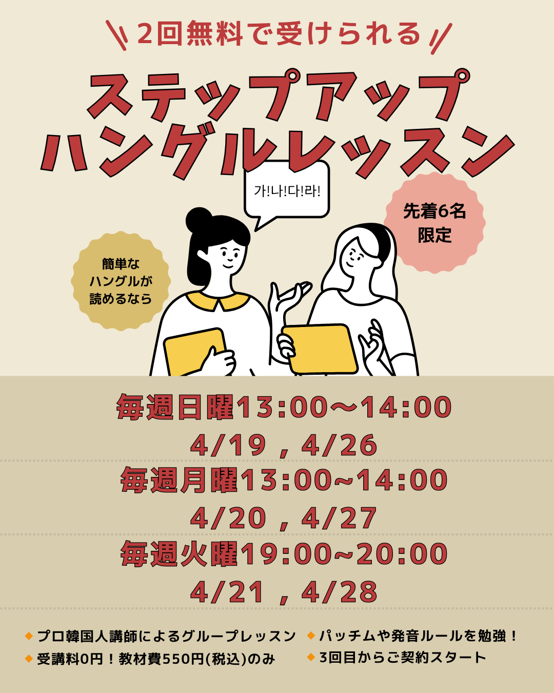 | <新大久保>独学のハングルを完璧にしよう!ハングルステップアップ講座 | 2026-04-03 |