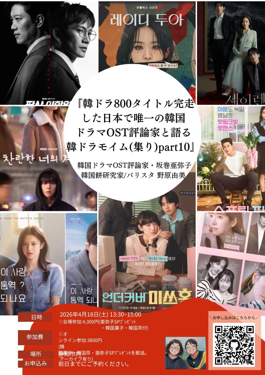 【申し込み】チラシ下のQR コードからお申し込みをお願い致します。備考欄に『韓国ドラモイム』とご記入頂き、今観ているドラマもありましたら一緒にご記入いただけたら嬉しいです。