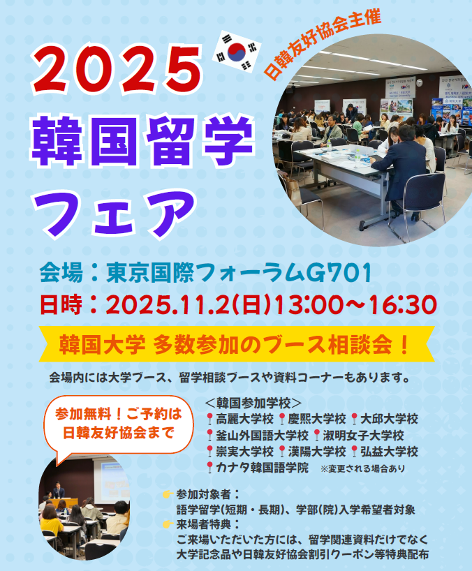 韓国から多数の大学関係者が来場します。大学ごとにブースを設けておりますので個別に相談が可能です。何校でも、何回でも自由に回れます。もちろん日本語で相談可能です。