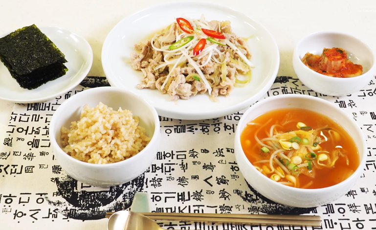 ①韓国料理動画「油味の豚プルコギとキムチと豆もやしのスープ」をご覧いただき、料理を作ってください。