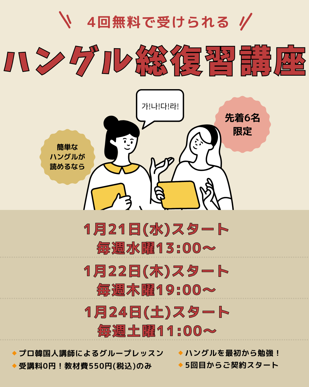 | <新大久保>無料なのに本格レッスン!初級韓国語 | 東京・新大... | 2026.1.9~1.30 | |