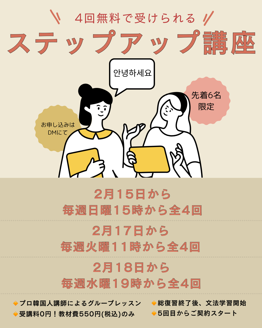 | <新大久保>ゼロレベルからはじめる!4回無料の韓国語... | 新大久保 | 2026.2.19~3.12 | |