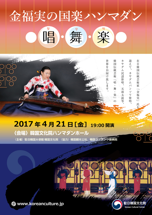 주일한국문화원에서는 재일한국전통예술가 김복실씨를 초청하여 한국의 전통예술을 선보이는 무대를 개최합니다. 판소리, 가야금 산조, 가야금 민요 병창, 오북 등 한국 전통 예술의 「창,무,악」의 세계로 여러분을 초대하오니 많은 관심 바랍니다.