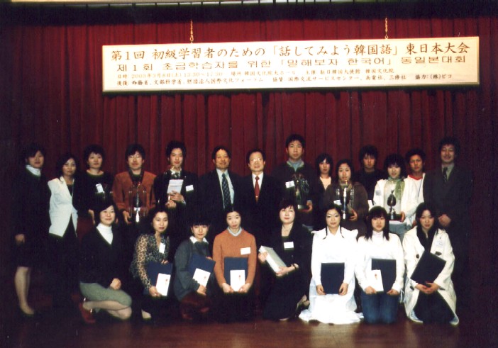 2003年3月8日(土)13:30より韓国文化院大ホールにて、第1回 初級学習者のための「話してみよう韓国語」東日本大会が開催されました。北は北海道、南は鹿児島から、高校1年生から78歳の方まで、様々な方がこれまで韓国語を学んだ成果を発表しに韓国文化院大ホールに訪れました。
