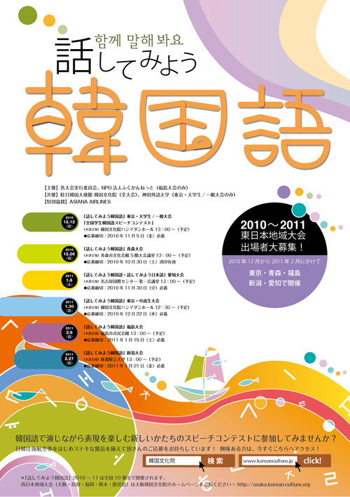 私達は、全ての韓国語学習者と教育者、そしてお越しいただくお客様の皆さんが韓国語を通して共に楽しむ大会を目指しています。是非皆さんお越しください!!(入場無料)